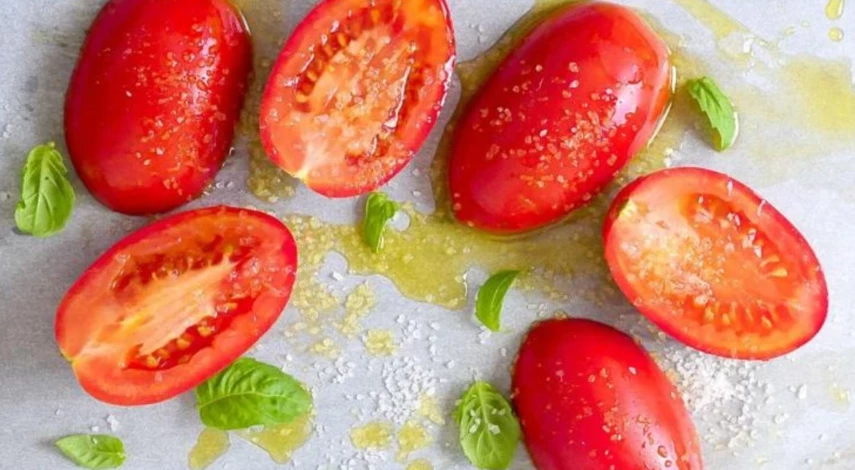 - На каждом помидоре сделайте крестообразный надрез. В каждый разрез вставьте по кусочку чеснока.
