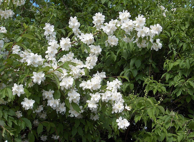 Стоит лишь вспомнить о том, как весеннюю белоснежность яблони, вишни и черемухи в нарядах невест сменяют всеми любимая белая сирень, очаровательная калина Бульденеж и чубушник, названия которого уже говорят сами за себя: Арктика, Снежки, Снежная буря, Лавина, Горностаевая мантия. Свою скромную лепту внесут и дерен с рябинолистником, боярышник и кизильник. Особо эффектными и, можно сказать, благородными среди белоцветущих кустарников считаются сортовые спиреи: серая Грефшайм, Вангутта и им подобные.Фото: Чубушник