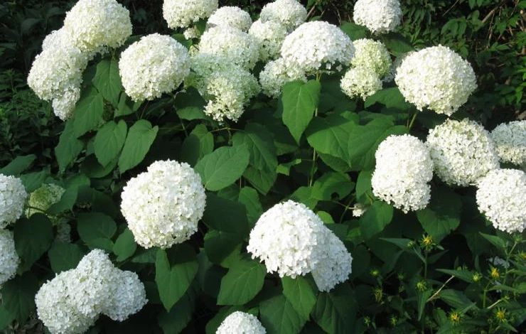 Не обойтись и без белых пионов, гортензий, волжанок, астильб, медуниц и хост. Последняя троица, между прочим, прекрасно чувствует себя и в тени. А ведь для затемненных мест белый цвет весьма актуален. Здесь же, в теневой зоне, можно поселить вариегатную сныть, но надо не забывать про ее весьма агрессивный характер.Фото: Гортензия