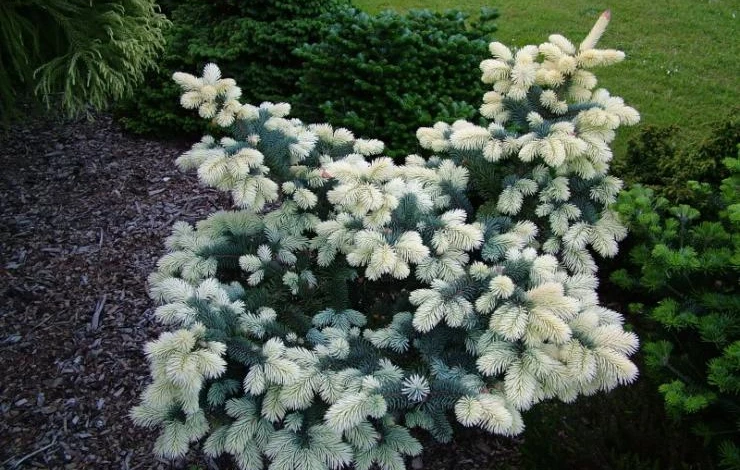 Сорт Бонсай Блю уже в молодом возрасте обильно обсыпан выразительными шишками сине-фиолетового цвета. Высота растения 0,5 м.