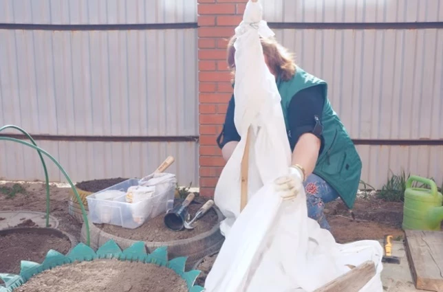 При отсутствии каркасного парника или теплицы растение следует спрятать от холодного ветра или ночных похолоданий под укрывным материалом. Опорой материалу служит колышек, который вбивают в покрышку рядом с ростком.