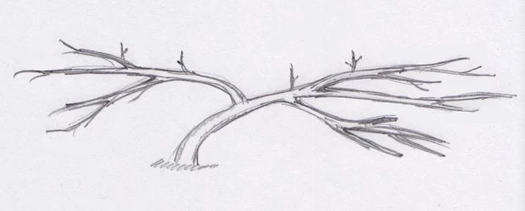 Таким образом, за 2—3 года выводят два горизонтальных плеча. Для активного обрастания этих плеч побегами, особенно у слабоветвящихся сортов, на 2—3 год после посадки можно укоротить побеги продолжения на 20—35% на нижнюю почку. Остальные вновь образовавшиеся побеги при их длине 15—20 см регулируют следующим образом: из конечных формируют побеги продолжения (пришпиливают горизонтально), нижние побеги вырезают на кольцо, из сильных боковых побегов формируют скелетные ветви 1 порядка (оставляют сильные побеги через 30—40 см), которые пришпиливают горизонтально, в перпендикулярном направлении от ствола. Побеги из верхних почек пинцируют (прищипывают) над 3—4 настоящим листом от основания (или надламывают, или скручивают) – для формирования плодовых образований
