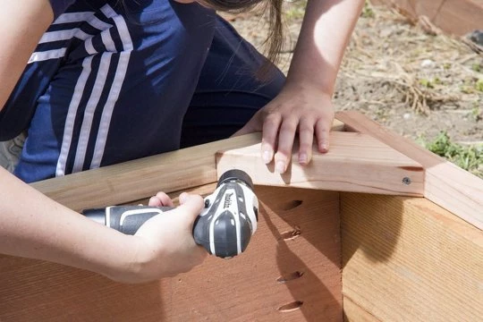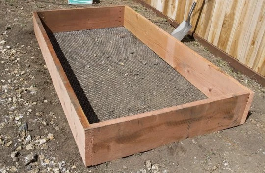 Соберите раму днища, скрепив доски шурупами. На дне закрепите мелкую металлическую сетку (она убережет растения от норных вредителей).