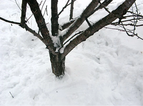 - Уделите внимание и плодовым деревьям и кустарникам. Сгребите собранный с дорожек снег к основанию стволов.