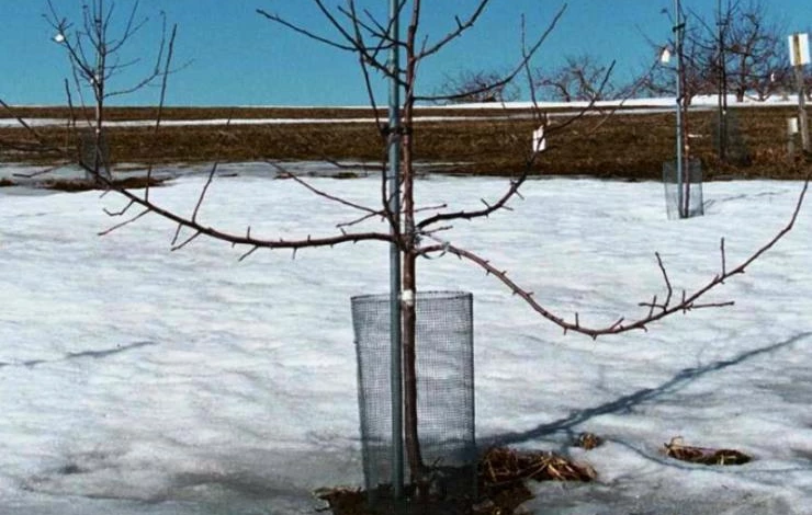 - На вашем участке мало снега? Тогда используем другой способ защиты — вокруг ствола наматываем металлическую сетку, рогожу или толь.