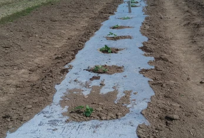 Фото: рассада арбузов на грядке, мульчированной пленкой