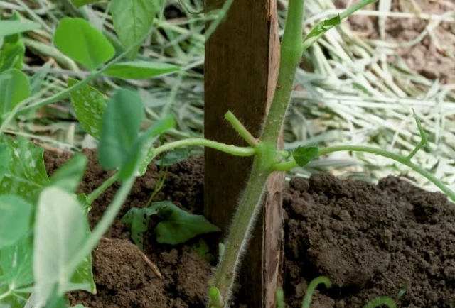 Подвязывать высокорослые помидоры можно к колышку или к шпагату, закрепленному на балках теплицы. Кусты с крупными тяжелыми плодами могут наклонять колышек в сторону, поэтому многие садоводы предпочитают второй способ подвязки.