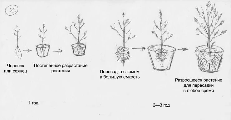 Растения, легко переносящие повреждение корней и пересадки, выкапывают (когда они достигнут нужного размера) и помещают в емкость.