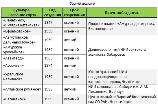Таблица: сорта яблони, районированные различными организациями и пригодные для выращивания в Приморском крае.