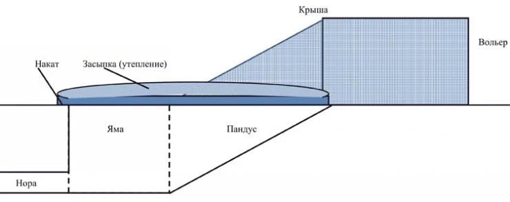 Одну сторону, желательно южную, надо выполнить пологой от поверхности до самого дна – тут кролики будут выбираться наверх, в вольер. Делать вольер все равно придется. И навес над вольером (и над ямой) – тоже, иначе зверьков зальет хорошим ливнем.