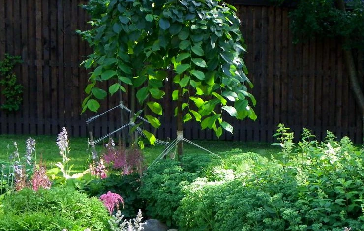 Штамбовые деревья с плакучей кроной: береза повислая, вяз шершавый, карагана древовидная, лиственница сибирская, рябина обыкновенная, яблоня, ясень обыкновенный. Например, ива козья образует симпатичный шатер, ветви которого лежат на земле. Весной дерево покрывается нежными сережками.