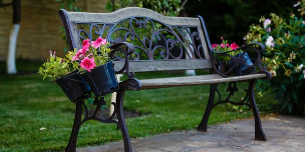 Декоративное обрамление. Скамейка эффектно впишется в окружение специально обустроенных цветочных клумб, находясь на площадке, выложенной искусственным камнем или тротуарной плиткой.