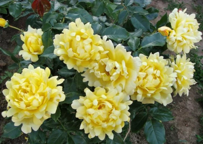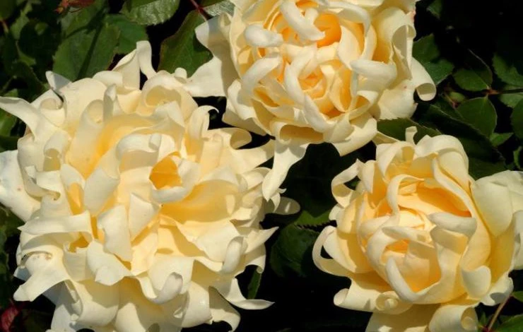 Сплендид Раффлс (Splendid Ruffles). Это Флорибунда с крупными (10 см) махровыми цветками, появляющимися в неболь­ших кистях. В начале цвете­ния они лимонно-желтые, со временем выгорают до сливочно-желтого оттенка.