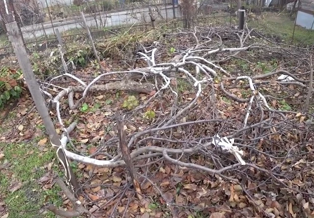 Сформированную стелющуюся культуру очень просто пригнуть на зиму:она прижимается к земле металлическими крючками или привязывается веревками к колышкам, вбитым в землю. На зимний период пригибают все ветви растения, а ценные прививки до первых снегопадов укрывают растительными остатками.