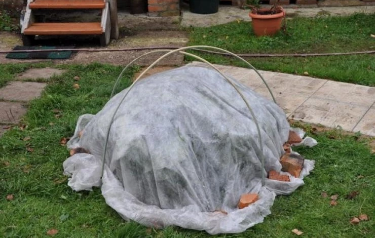 • Сверху короба креплю рейки крест-накрест, чтобы снег не продавил укрытие, в качестве крыши кладу фрагмент плекса или фанеры, оборачиваю короб двумя слоями нетканого материала и обвязываю его веревкой.