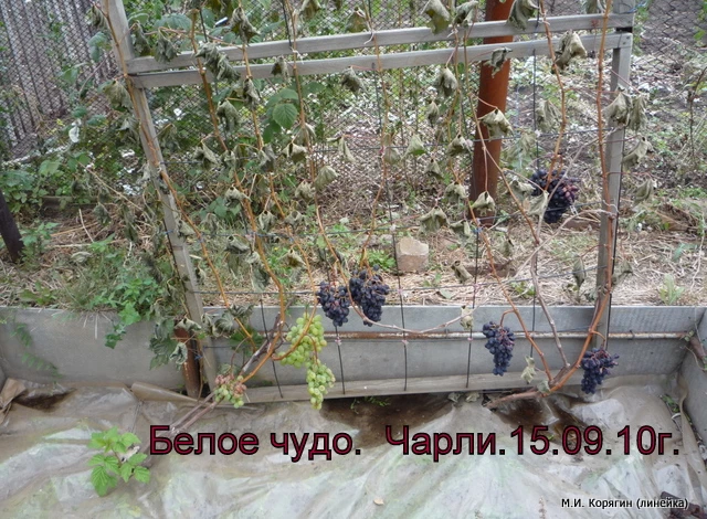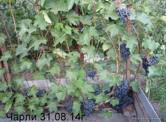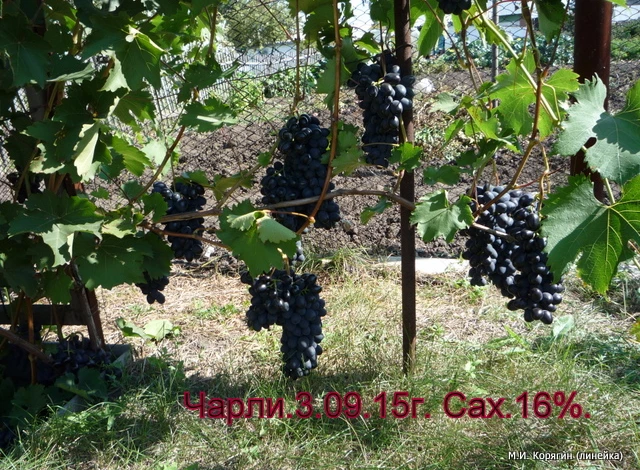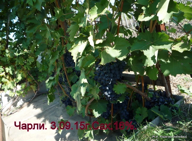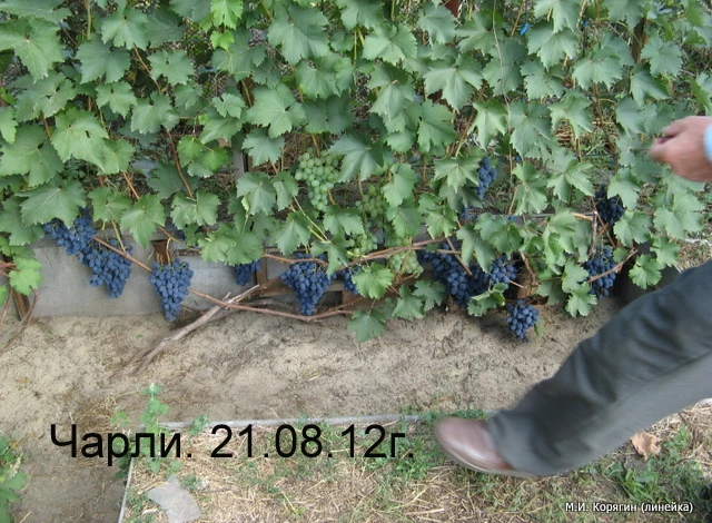 Авторское описание: Чарли (Виктория х Надежда АЗОС) столовая гибридная форма очень раннего срока созревания.Созревает в первой половине августа. Цветок обоеполый. Среднерослая. Гроздь крупная и очень крупная 600 - 800г.,без горошения. Ягоды крупные 6-7г. овальные, чёрного цвета. Мякоть плотная. Вкус приятный, гармоничный. Побеги вызревают рано по всей длине. Укоренение черенков хорошее. Устойчив к милдью, оидиуму-2,5 балла, серой гнили-3,0 балла.Морозостойкость до 25 градусов. Город Новошахтинск.