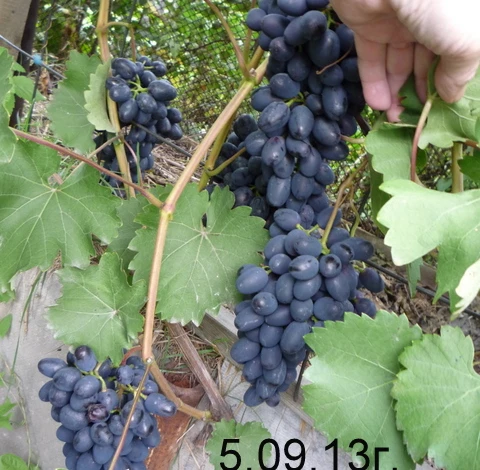 3. 09. 14г. заморозок - 2 градуса. 4. 09.- 3 градуса и 5. 09. на почве до - 5 градусов. Но ягоды и лоза к этому времени уже вызрели. Кусты прошедшие жёсткий клоновый отбор хорошо перезимовали и обеспечили отличный урожай следующего года.
