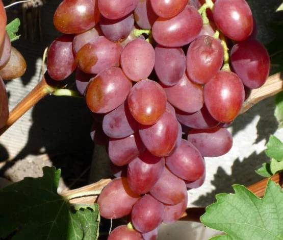 Одиссей* - столовая форма винограда очень раннего срока созревания 95-100 дней. Кусты средней силы роста. Цветок обоеполый. Грозди крупные 500-700 г, ягоды крупные и очень крупные, округлые без горошения, розовые, массой 6-9 г, при созревании с мускатным ароматом и густым пруиновым налетом. Сахаронакопление хорошее.