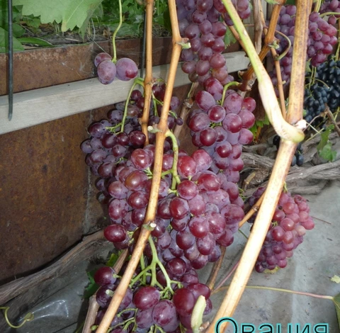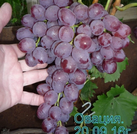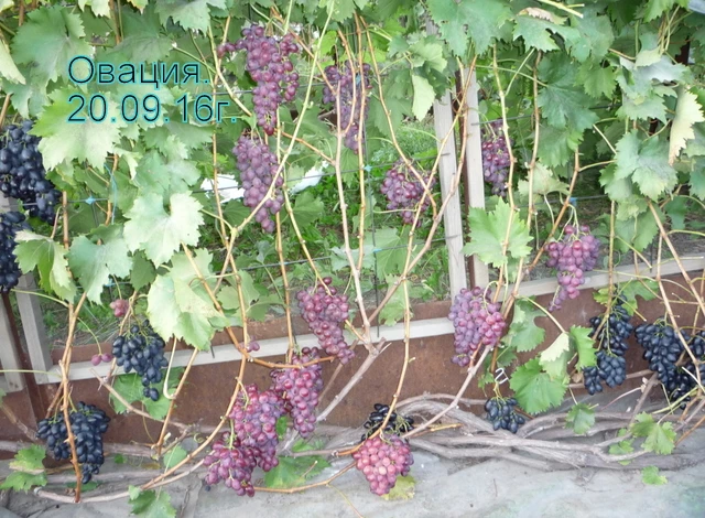 Фото винограда сорта "Овация". Выращено в траншеях по авторской Обской технологии. Показатели сахара: на 17 августа 2016 года сахар 15-18 %; на 8 сентября 2016 года сахар 21 %. Сорт товарный. Хорошо хранится на кустах. Ягода не трескается. По сторонам от Овации грозди Надежды обской не разместившиеся на отведённой ей при посадке площади. Часть урожая снята для выставок и потребления.