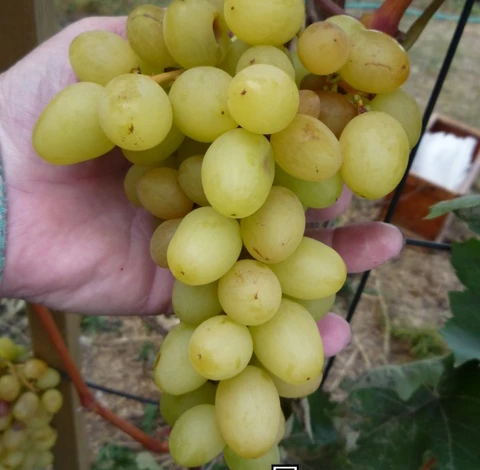 Столовая форма очень раннего срока созревания 100-110 дней. Цветок обоеполый. Корнесобственные насаждения средней силы роста. Грозди 500-600 г и более, конические. Ягоды крупные 28х21 мм, при созревании янтарно-желтые, гармоничного вкуса, мякоть мясистая, хрустящая, кожица плотная, съедаемая. Осами практически не повреждается. Горошение ягод не наблюдалось. Урожайность высокая и стабильная. Урожай долго сохраняется на кустах, не теряя товарного качества.