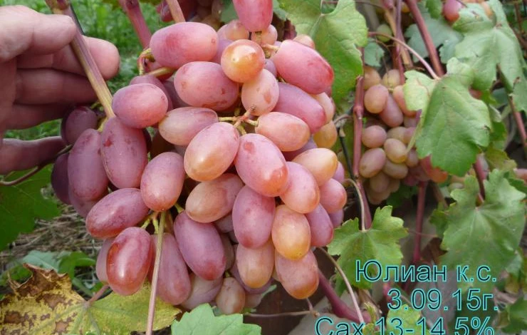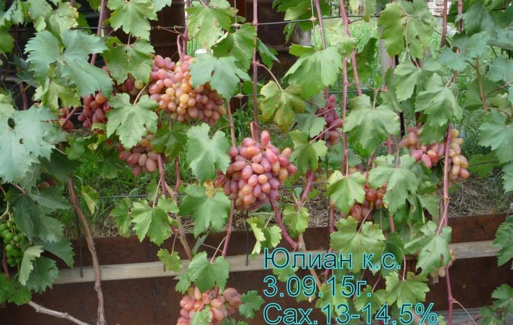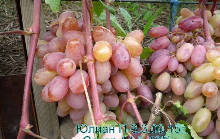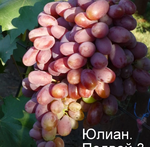 Юлиан (Кеша х Ризамат). Новая столовая форма сверхраннего срока созревания (95-105 дней). Цветок обоеполый. Корнесобственные насаждения большой силы роста. Грозди очень крупные, похожи по форме на сорт Ризамат, на длинной плодоножке, средне-рыхлые.