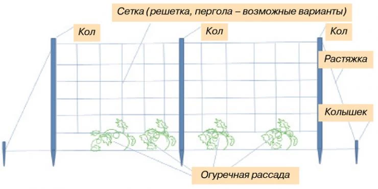 Расположение сеток-решеток может быть любым, главное, чтобы огурец всегда нашел, за что уцепиться, и вырос.