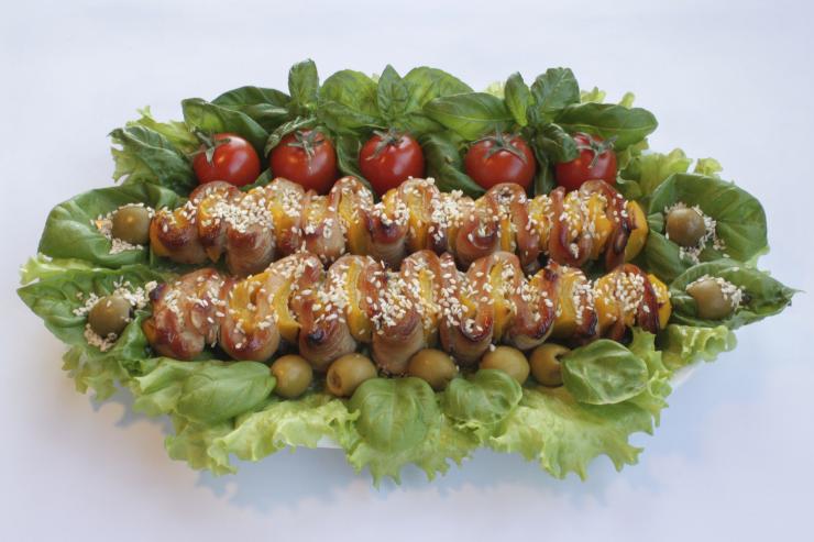 - Каждый кусочек рыбы заворачивайте в бекон и нанизывайте на шампур, чередуя с луком и сладким перчиком.