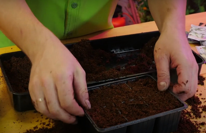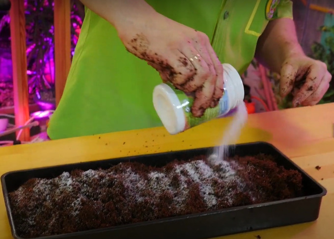 После посева в лейке разводится препарат «Споробактерин», необходимый, чтобы изначально заселить кокосовый субстрат полезной микрофлорой. Достаточно залить раствор в поддон так, чтобы влага в дальнейшем пропитала весь субстрат, и накрыть. Всходы появятся примерно через неделю.