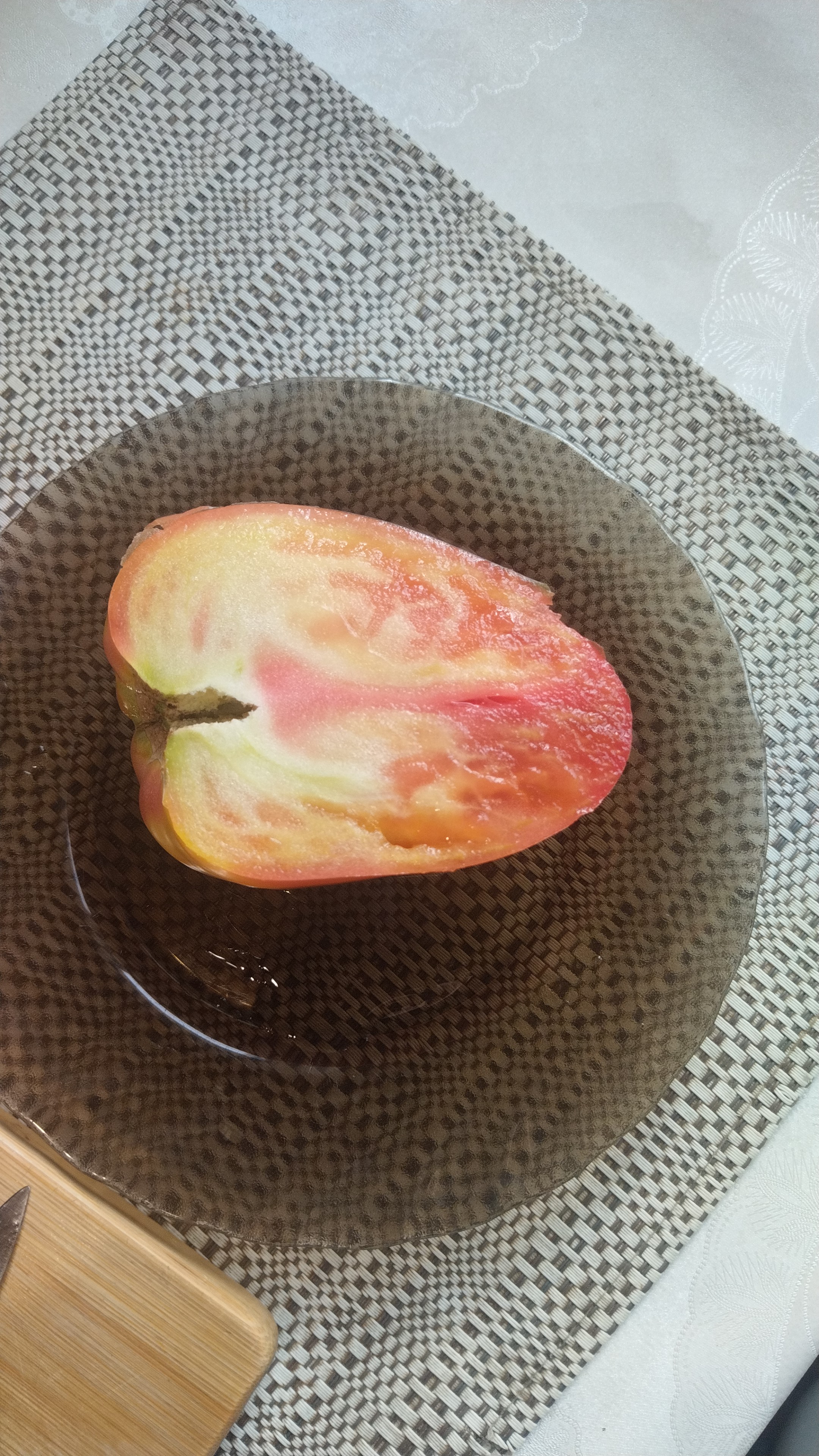 Доброго дня. Это может быть не один вариант причины. В одном случае это нехватка калийного питания и подкормка сульфатом калия решает проблему вызревания. Второе, белые и жесткие прожилки в середине плода говорят о заражении столбуром. Это вирус и лечению не подлежит, Семена с такого плода не берем, на вкус он жесткий. Третье, бывает у крупноплодных сортов такая серединка, она нужна для того, чтобы держать плод. У мелких плодов такого чаще не наблюдается.