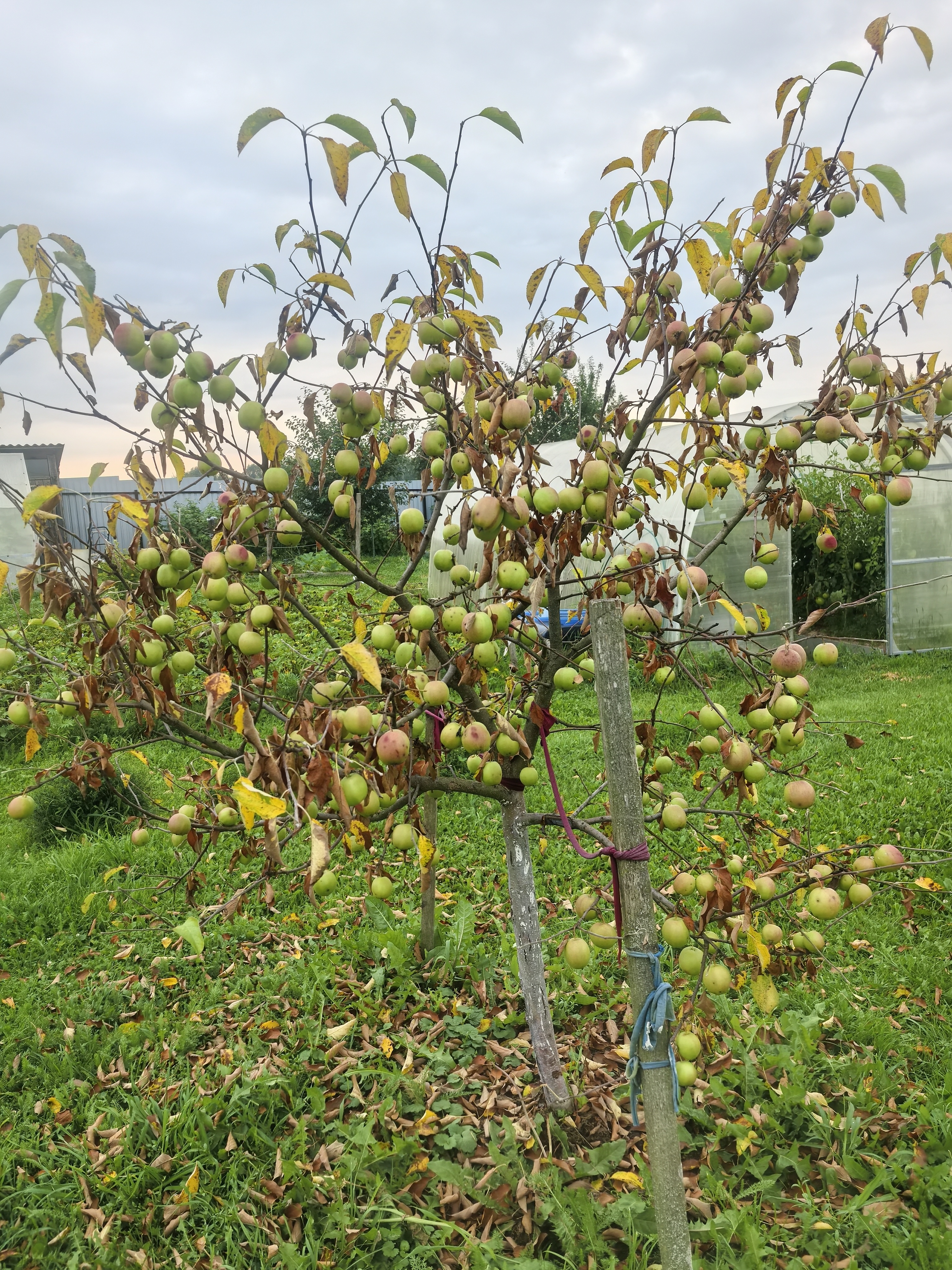 Яблоня покрылось красной точечкой, опраскала от вирусов. Были точки и на яблоках. Лучше не стало, будто еще сильнее начали желтеть листья. Добавили калий, ничего. И вот такая картина, остались плоды, листья все облетели, дерево не сухое. Помоги спасти. Рядом сидят какие яблони, все живые. Их то же обработали от вируса. Препарат не помню.