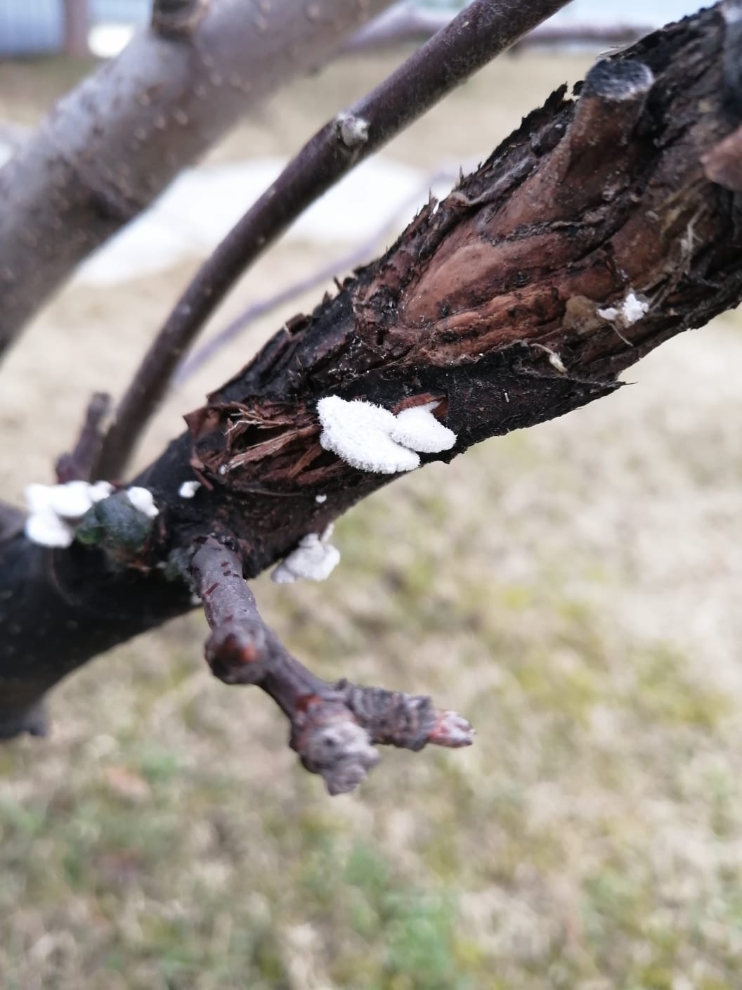Здравствуйте. Грибницы и мхи с лишайниками начинают расти на ослабленном дереве, которое больно или повреждено. Здесь, видимо, грибы разрастаются. Кора потрескалась и отходит. Нужно заниматься здоровьем дерева, повреждения очищать от отслаивающейся коры, залечивать