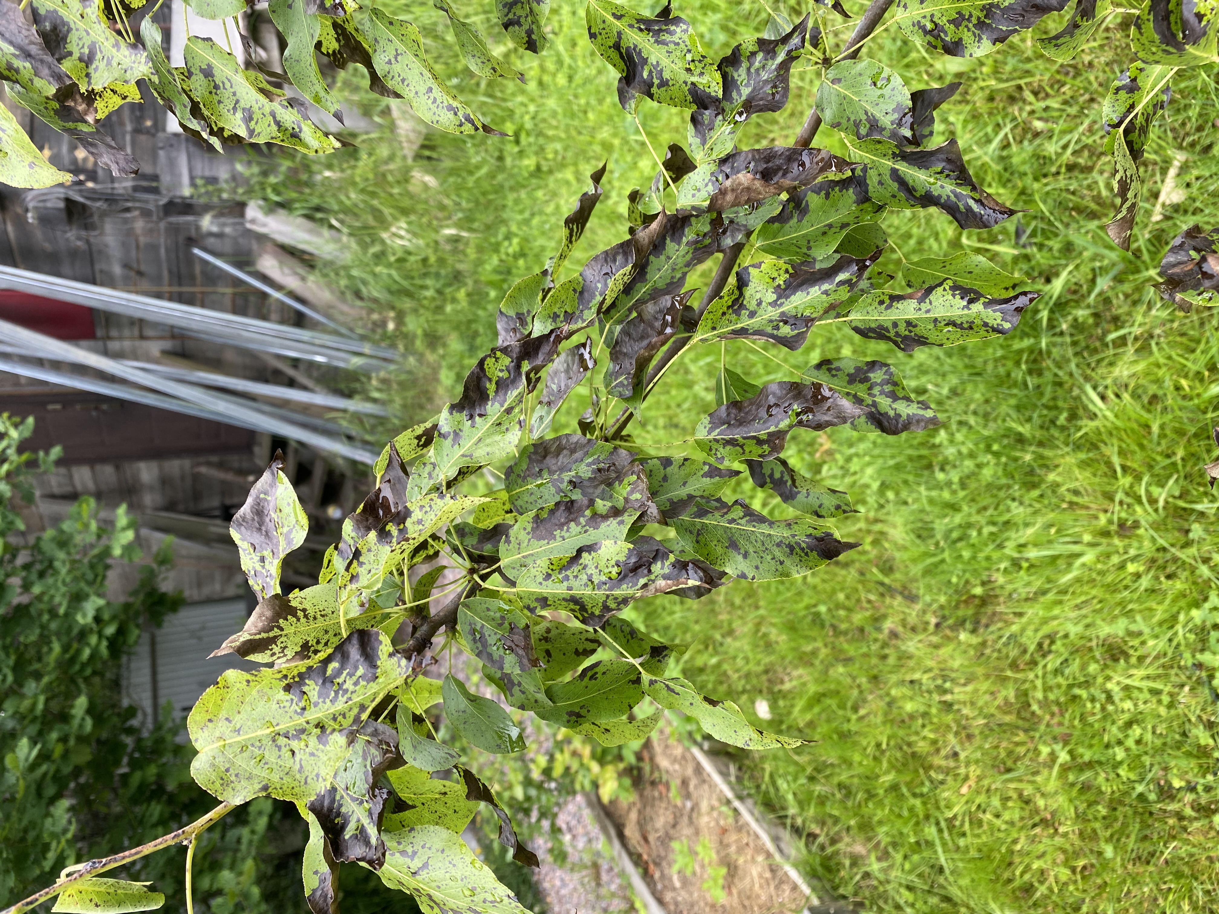 Здравствуйте. Так может проявиться грибковое заболевание и нужно после потери листьев осенью провести обработку опрыскиванием мочевиной 600гр на 10 л воды. Сожжённые таким образом листья убрать из-под растения. Сейчас если часть листьев еще есть, останавливать болезни можно скор+ хорус