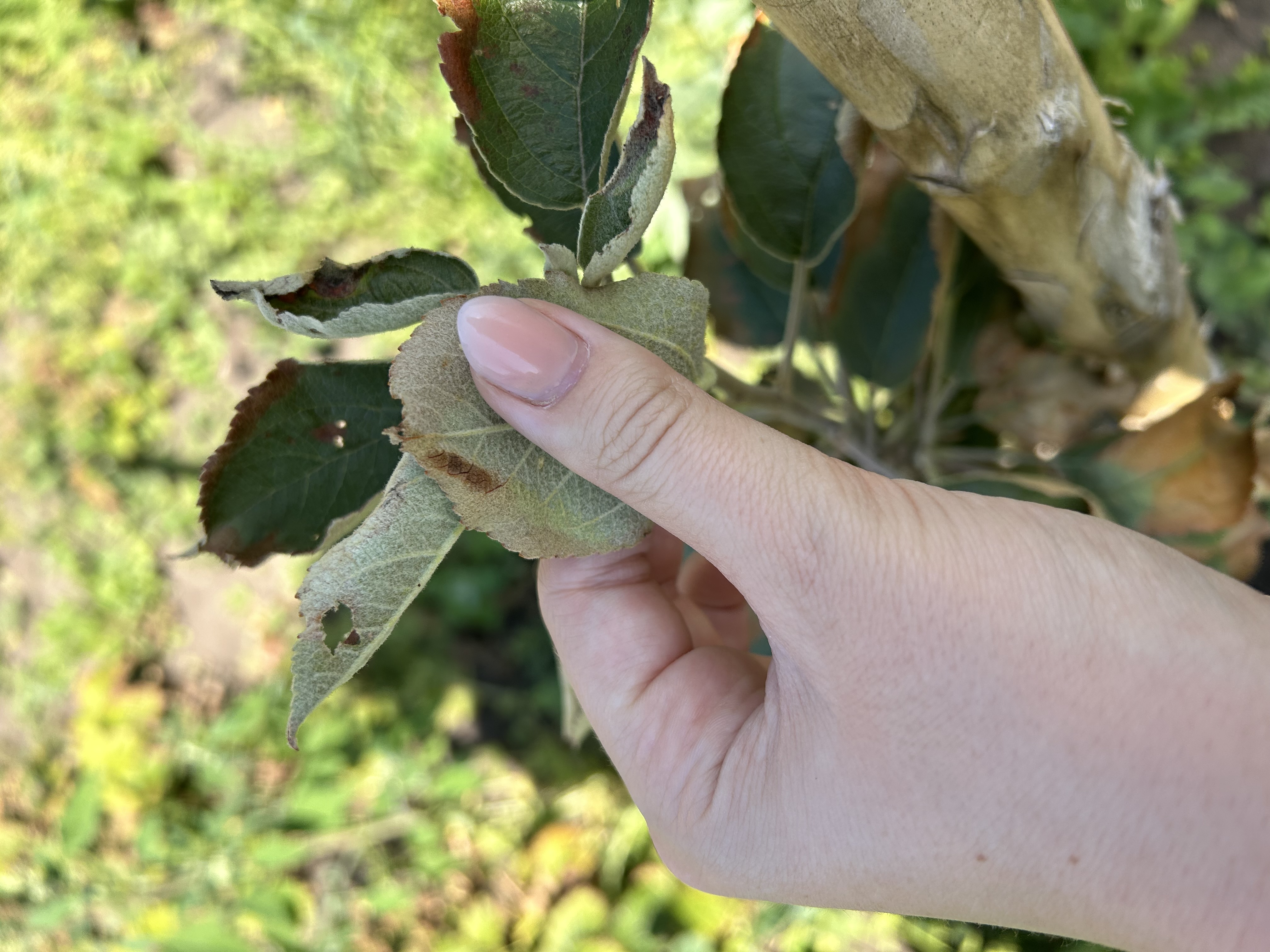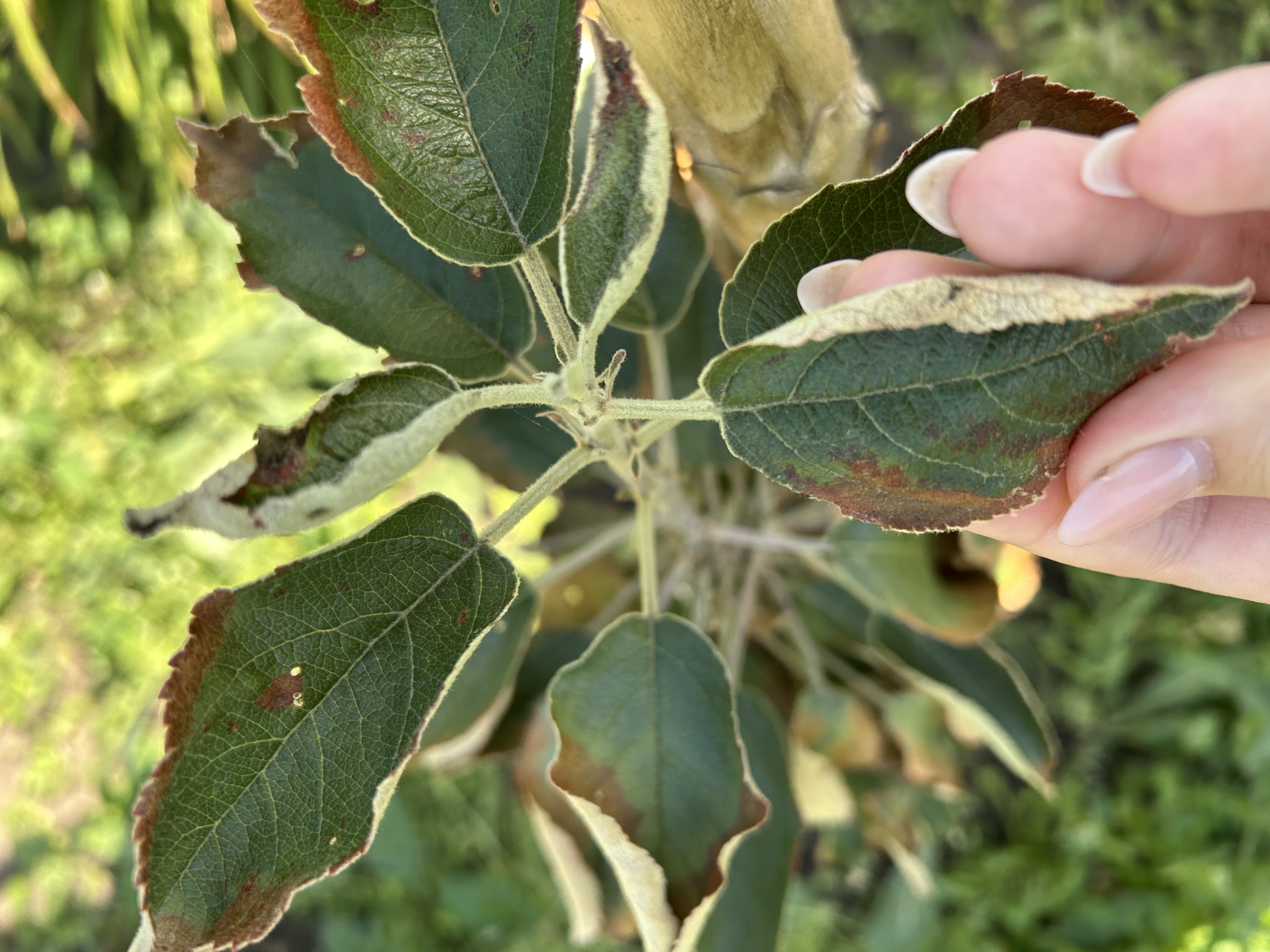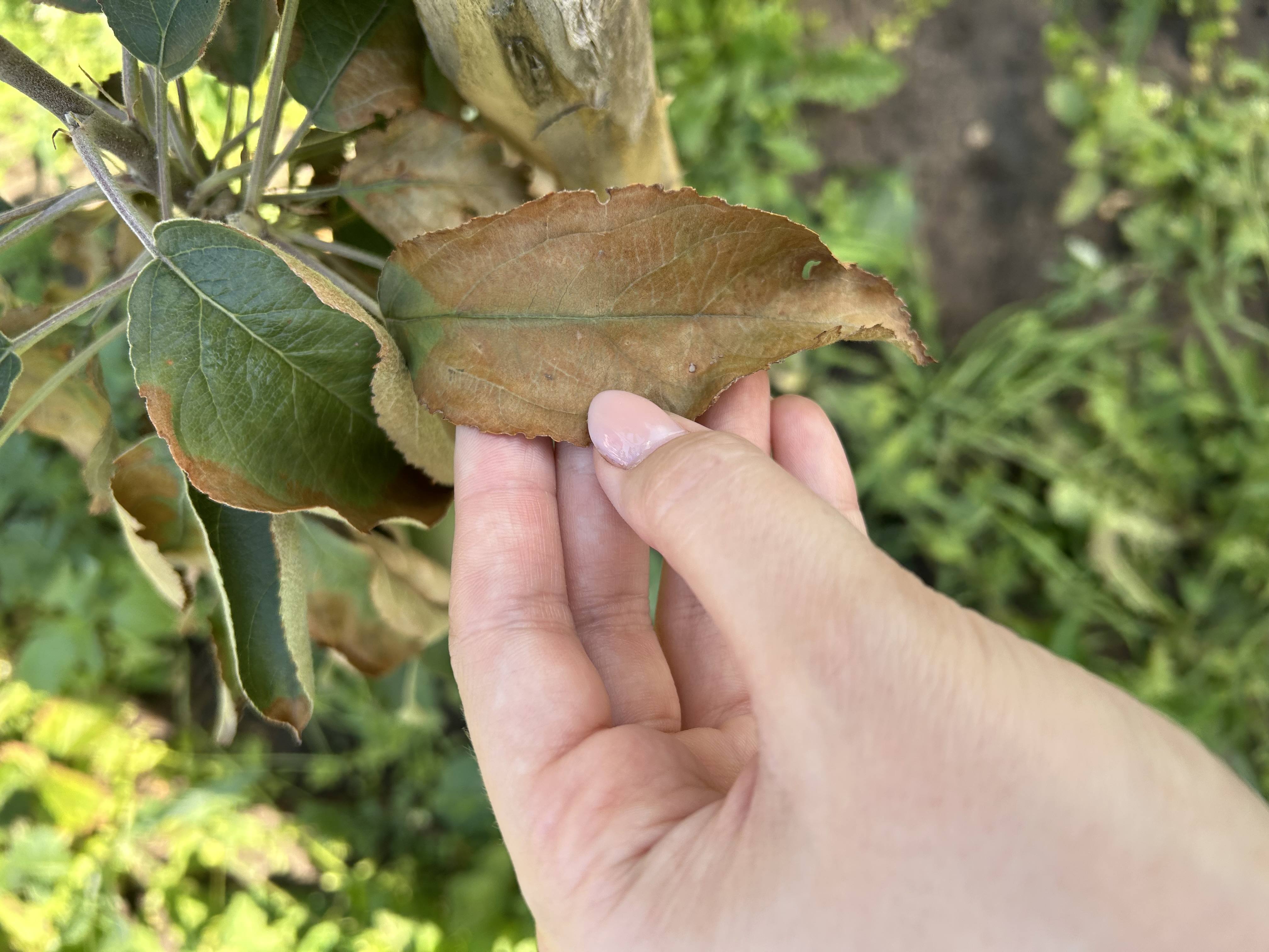 Здравствуйте. Здесь могла быть обработка по листу с каким-то средством и такая реакция ожога получилась. Края листьев становятся коричневыми и крошатся обычно из-за дефицита калия. Возможно есть и проблема полива. У колоновидных яблонь небольшая корневая система и поливать их нужно чаще обычных крупных деревьев.