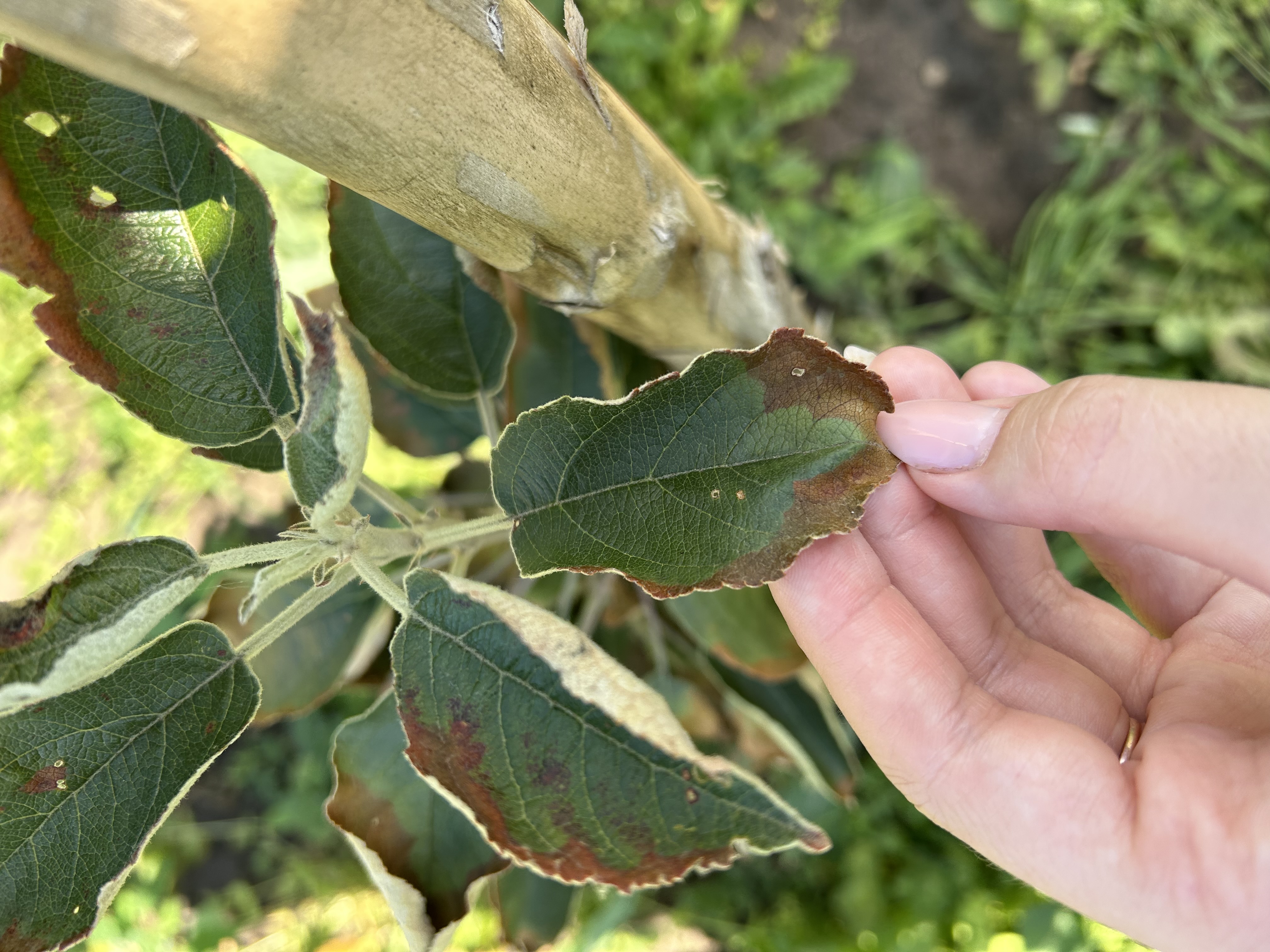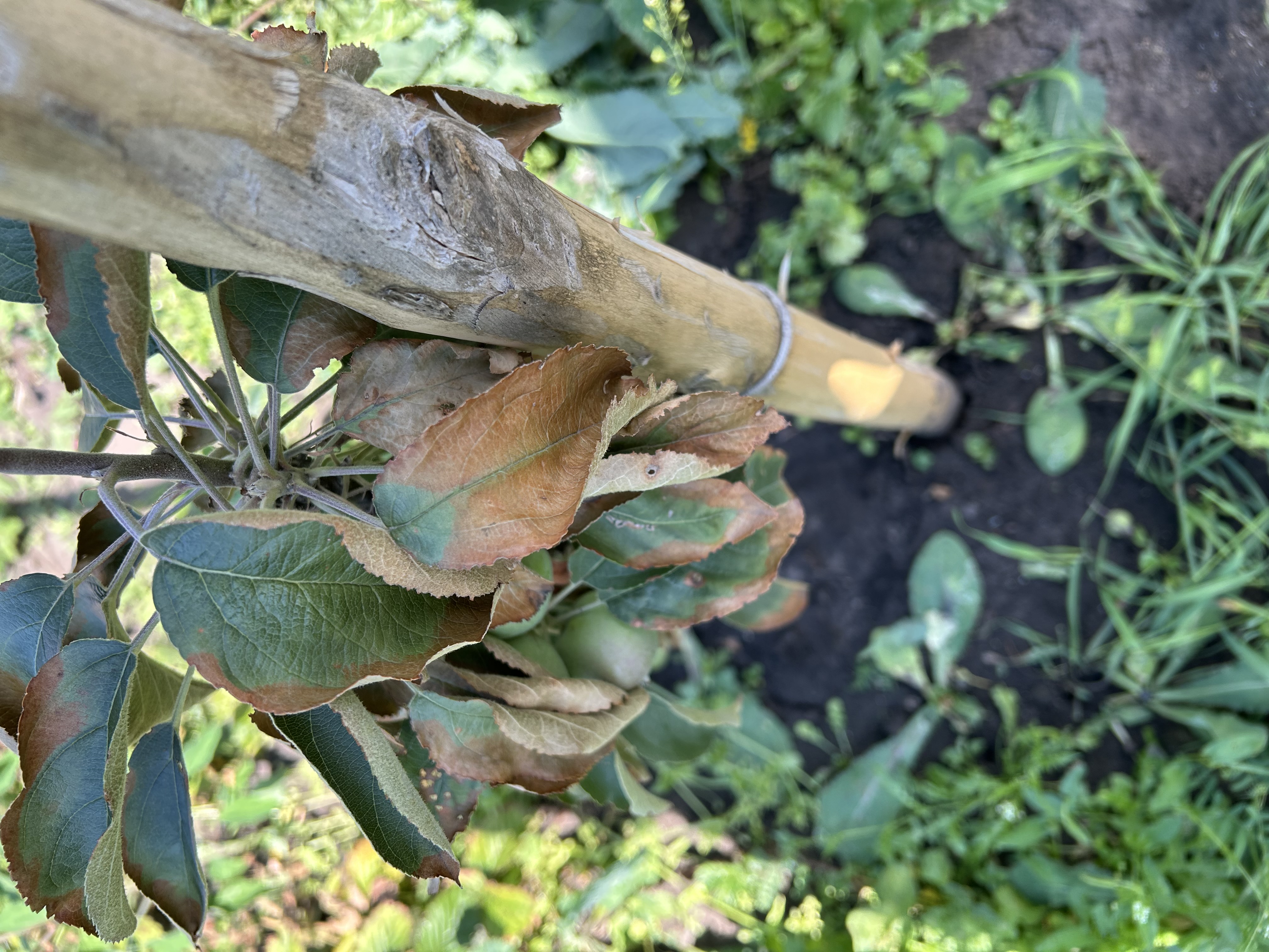 Здравствуйте! На колоновидной яблони стали коричневыми все листья. Что это может быть? Как и чем лечить?